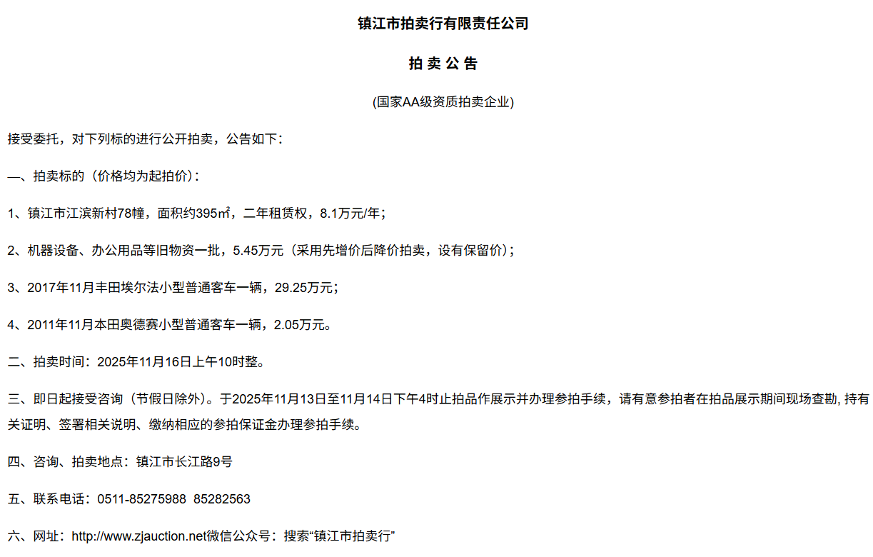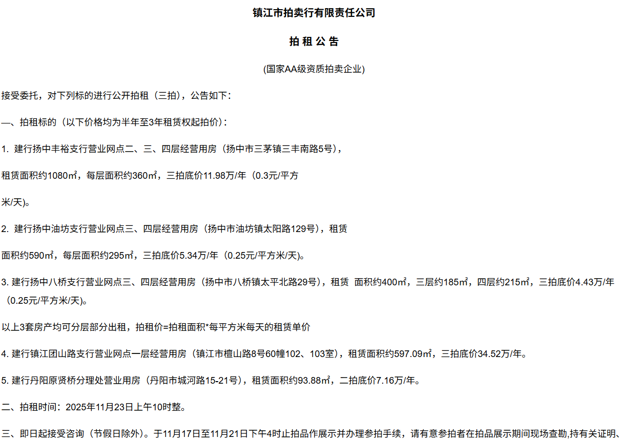 鎮江市拍賣行有限責任公司拍 租 公 吿(國家AA級資質拍賣企業)接受委托,對下列標的進行公開拍租(三拍),公告如下:—、拍租標的(以下價格均為半年至3年租賃權起拍價):1.  建行揚中豐裕支行營業網點二、三、四層經營用房(揚中市三茅鎮三豐南路5號),租賃面積約1080㎡,每層面積約360㎡,三拍底價11.98萬/年(0.3元/平方米/天)。2.  建行揚中油坊支行營業網點三、四層經營用房(揚中市油坊鎮太陽路129號),租賃面積約590㎡,每層面積約295㎡,三拍底價5.34萬/年(0.25元/平方米/天)。3. 建行揚中八橋支行營業網點三、四層經營用房(揚中市八橋鎮太平北路29號),租賃  面積約400㎡,三層約185㎡,四層約215㎡,三拍底價4.43萬/年(0.25元/平方米/天)。以上3套房產均可分層部分出租,拍租價=拍租面積*每平方米每天的租賃單價4. 建行鎮江團山路支行營業網點一層經營用房(鎮江市檀山路8號60幢102、103室),租賃面積約597.09㎡,三拍底價34.52萬/年。5. 建行丹陽原賢橋分理處營業用房(丹陽市城河路15-21號),租賃面積約93.88㎡,二拍底價7.16萬/年。二、拍租時間:2025年11月23日上午10時整。三、即日起接受咨詢(節假日除外)。于11月17日至11月21日下午4時止拍品作展示并辦理參拍手續,請有意參拍者在拍品展示期間現場查勘,持有關證明、簽署相關說明、繳納相應的參拍保證金辦理參拍手續。四、咨詢、拍租地點:鎮江市長江路9號五、聯系方式:0511-85275988   13655299933楊先生六、網址:http://www_zjauction_net.palmorama.com;微信公眾號:搜索“鎮江市拍賣行” 拍品清單2025.11.23序號名稱起拍價(元)標的說明1建行揚中豐裕支行營業網點二、三、四層經營用房(揚中市三茅鎮三豐南路5號),租賃面積約1080㎡,每層面積約360㎡三拍底價11.98萬/年(0.3元/平方米/天)1、1-3號房產均可分層部分出租,拍租價=拍租面積*每平方米每天的租賃單價;2、意向競拍人在拍賣前需持營業執照或身份證與委托方說明租賃房產經營業態,確定意向后出具房產承租用途承諾書,經委托方審核后,方可交納保證金參加競拍;3、租賃期限為半年至3年(承租方與出租方協商而定),承租方每半年或一年結付租金,租賃期間的水、電費用及其它相關費用均由承租方承擔;4、承租方不得用于經營和保管危險物品,不得用于開設餐飲、娛樂等可能嚴重影響消防安全、運營安全的經營業態,不得用于經營委托貸款、小額貸款等可能冒用委托方名義,帶來聲譽風險的經營業態。租賃期內,承租方不得破壞墻體結構,自行成就消防、安全等使用條件,不得擅自將租賃房屋轉租、轉讓給他人使用,否則委托方有權收回房屋;5、拍租成交后,承租方將租金交至出租方指定賬戶,傭金交至拍賣方賬戶(拍租傭金為該房屋一個月租金)。承租方憑租賃合同無息退還保證金。2建行揚中油坊支行營業網點三、四層經營用房(揚中市油坊鎮太陽路129號),租賃面積約590㎡,每層面積約295㎡三拍底價5.34萬/年(0.25元/平方米/天)3建行揚中八橋支行營業網點三、四層經營用房(揚中市八橋鎮太平北路29號),租賃面積約490㎡,每層面積約245㎡三拍底價4.43萬/年(0.25元/平方米/天)4建行鎮江團山路支行營業網點一層經營用房(鎮江市檀山路8號60幢102、103室),建筑面積約597.09㎡三拍底價34.52萬/年5建行丹陽原賢橋分理處營業用房(丹陽市城河路15-21號),建筑面積約93.88㎡二拍底價7.16萬/年
